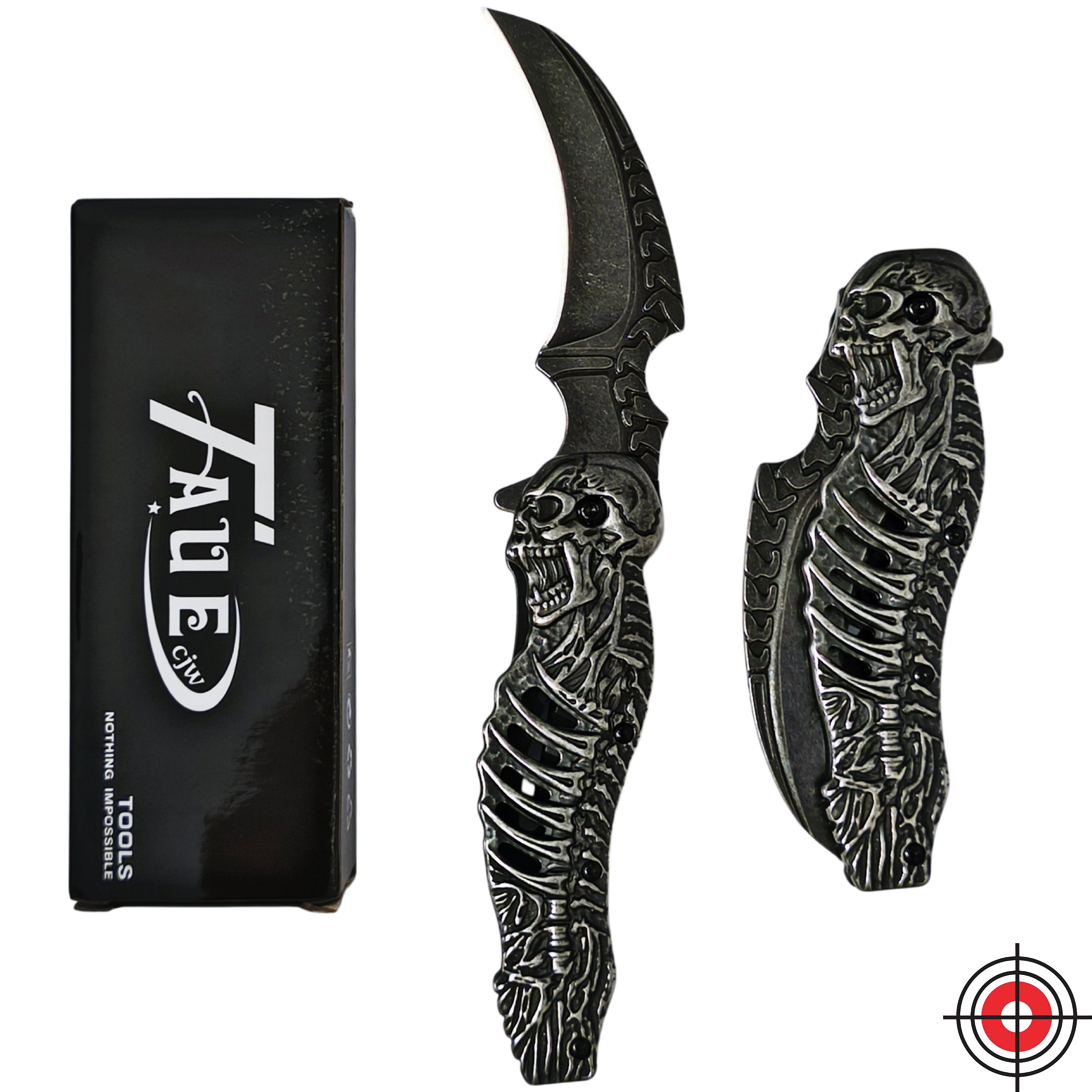 Com um desenho auto-relevo de caveira na lâmina, este canivete não só é funcional, mas também estiloso e único.